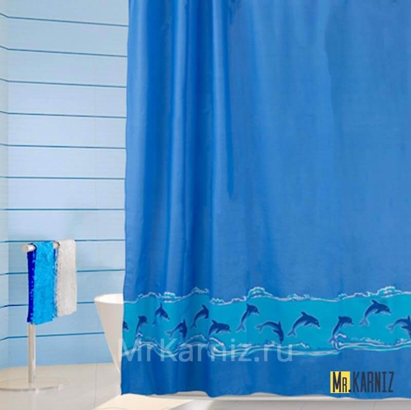 Штора для ванной Date. Штора имеет Синий цвет и 12 отверстий под кольца. В высоту штора 180 см, шириной 180 см.
